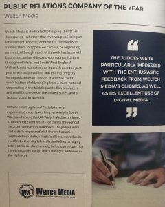 Weltch Media was named Public Relations Company of the Year in the awards, announced in May. We were hoping to collect the certificate at a ceremony in Cardiff, but it couldn't take place due to the Covid-19 restrictions.